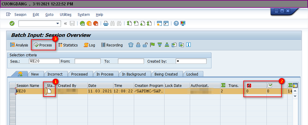 [1] Select “Display errors only” -> [2] Check “Default Dynpro Size” ->[3] process upload