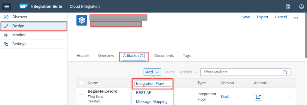 - Go to packages, at tab Artifacts click Add dropdown button and choose Integration Flow