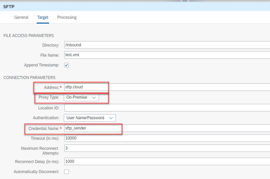 - Add Receiver Adapter with Type SFTP and configure as below to connect to SFTP on-premise