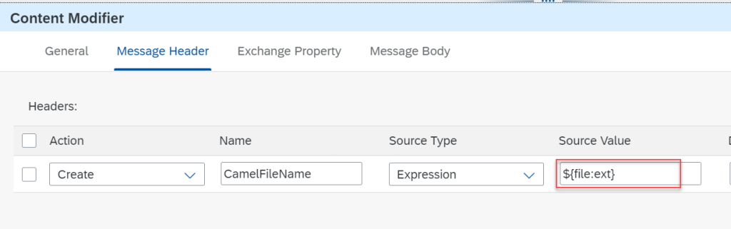 In this content modifier, we will create header with name CAMELFILENAME to get extension of file which get from SFTP folder.