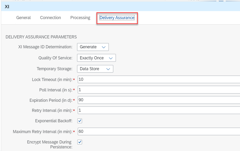 - Encrypt Message During Persistence: You define if the message is to be encrypted in the data store during temporary storage. Note that this is recommended for sensitiv data but it reduces the performance slightly.