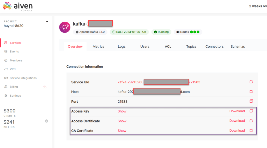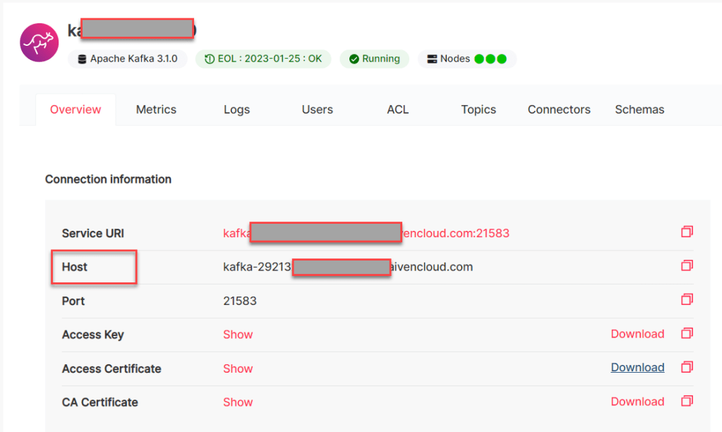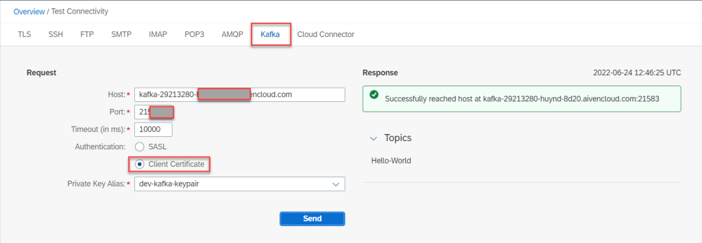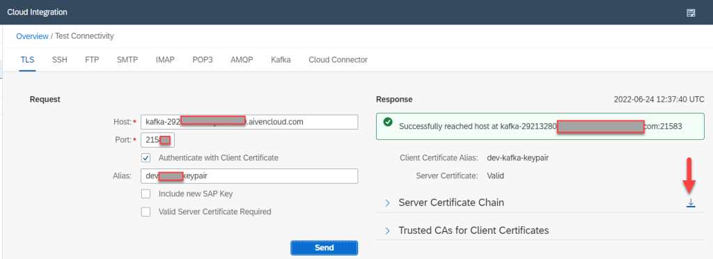 Use keypair in step 3 with host and port kafka to test connection to kafka service and download server certificate