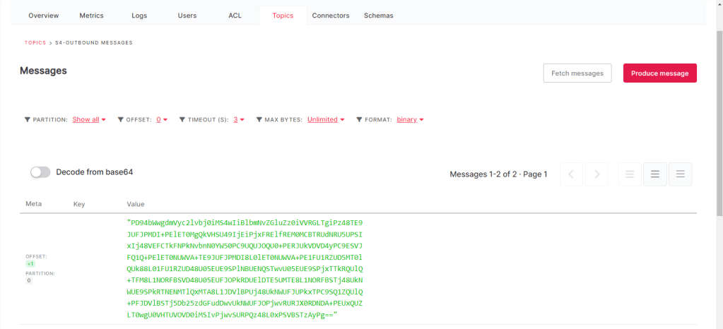 Binary : we have to convert payload to base64 and after that save it into Kafka with Binary