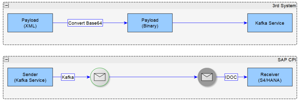 With this format, 3rd system will create payload with Format XML, after that convert XML payload to Base64 and send to Kafka