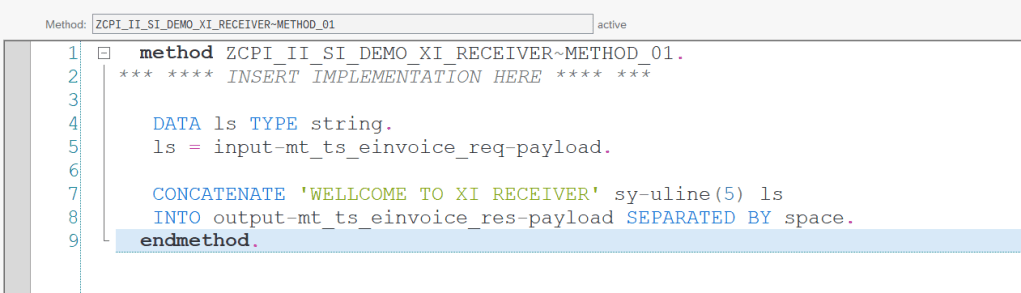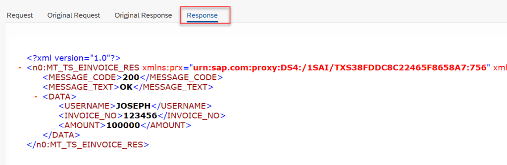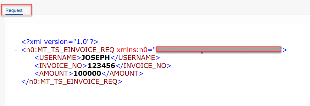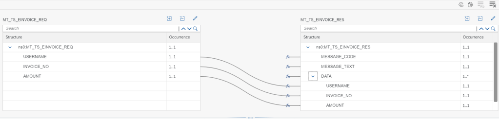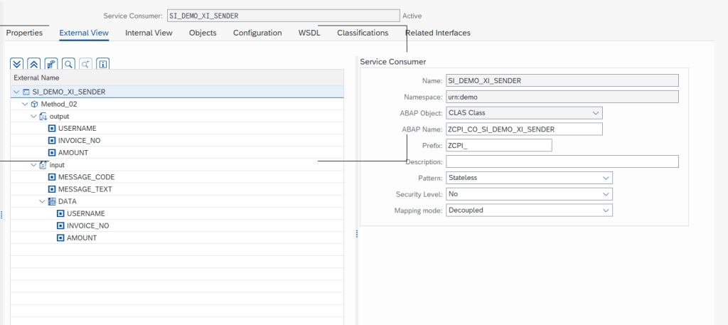 In this operation, we have request (Output) and response (Input). ABAP program will call this consumer service with input data is USERNAME, INVOICE_NO, AMOUNT. After that send request to CPI with adapter XI Sender.