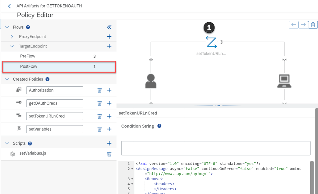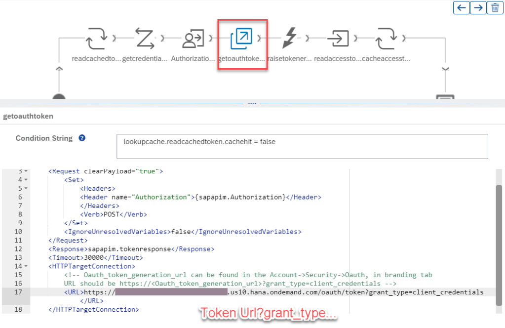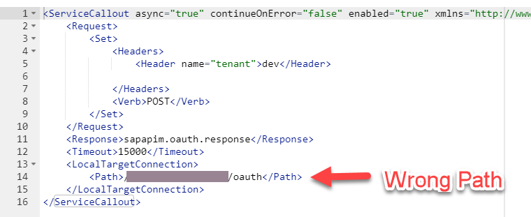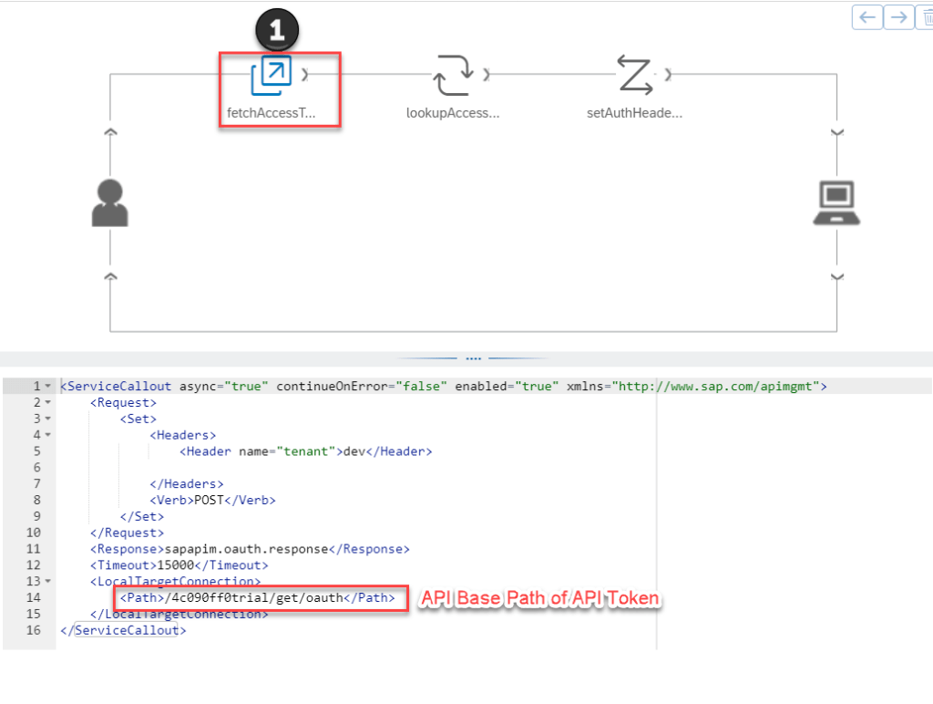 Call to API internal get access token<ServiceCallout async="true" continueOnError="false" enabled="true" xmlns="http://www.sap.com/apimgmt"> <Request> <Set> <Headers> <Header name="tenant">dev</Header> </Headers> <Verb>POST</Verb> </Set> </Request> <Response>sapapim.oauth.response</Response> <Timeout>15000</Timeout> <LocalTargetConnection> <Path>/4c090ff0trial/get/oauth</Path> </LocalTargetConnection> </ServiceCallout>