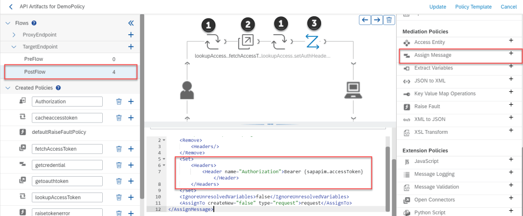 <AssignMessage async="false" continueOnError="false" enabled="true" xmlns='http://www.sap.com/apimgmt'> <Remove> <Headers/> </Remove> <Set> <Headers> <Header name="Authorization">Bearer {sapapim.accessToken}</Header> </Headers> </Set> <IgnoreUnresolvedVariables>false</IgnoreUnresolvedVariables> <AssignTo createNew="false" type="request">request</AssignTo> </AssignMessage>