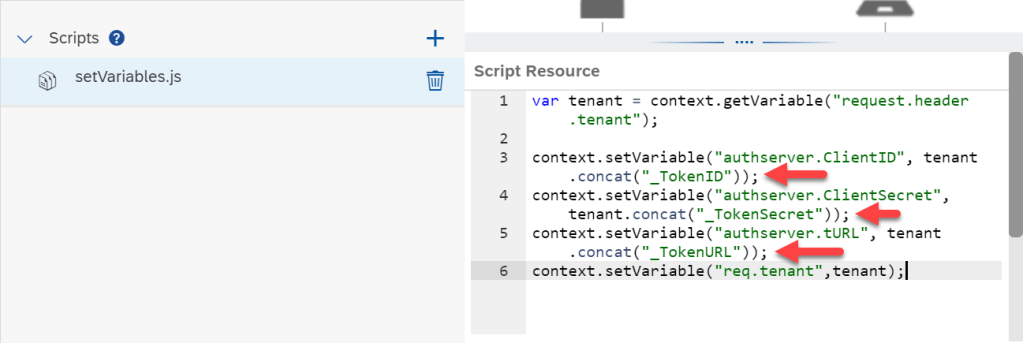 code javascript for Policy setVariable.var tenant = context.getVariable("request.header.tenant"); context.setVariable("authserver.ClientID", tenant.concat("_TokenID")); context.setVariable("authserver.ClientSecret", tenant.concat("_TokenSecret")); context.setVariable("authserver.tURL", tenant.concat("_TokenURL")); context.setVariable("req.tenant",tenant);