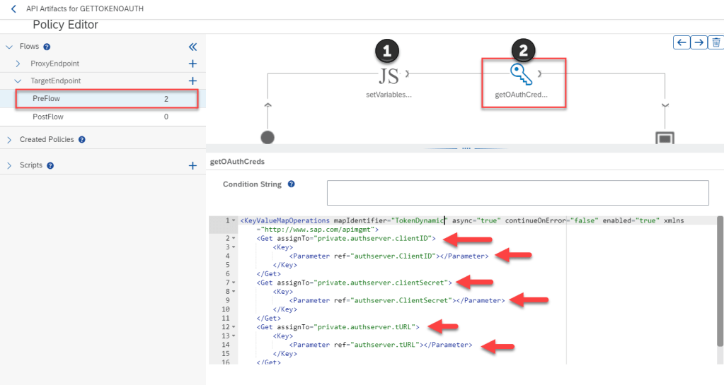 <KeyValueMapOperations mapIdentifier="TokenDynamic" async="true" continueOnError="false" enabled="true" xmlns="http://www.sap.com/apimgmt"> <Get assignTo="private.authserver.clientID"> <Key> <Parameter ref="authserver.ClientID"></Parameter> </Key> </Get> <Get assignTo="private.authserver.clientSecret"> <Key> <Parameter ref="authserver.ClientSecret"></Parameter> </Key> </Get> <Get assignTo="private.authserver.tURL"> <Key> <Parameter ref="authserver.tURL"></Parameter> </Key> </Get> <Scope>environment</Scope> </KeyValueMapOperations>
