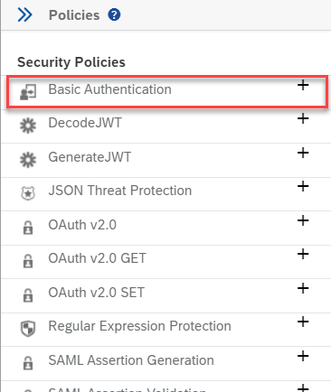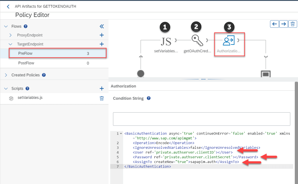 <BasicAuthentication async='true' continueOnError='false' enabled='true' xmlns='http://www.sap.com/apimgmt'> <Operation>Encode</Operation> <IgnoreUnresolvedVariables>false</IgnoreUnresolvedVariables> <User ref='private.authserver.clientID'></User> <Password ref='private.authserver.clientSecret'></Password> <AssignTo createNew="true">sapapim.auth</AssignTo> </BasicAuthentication>
