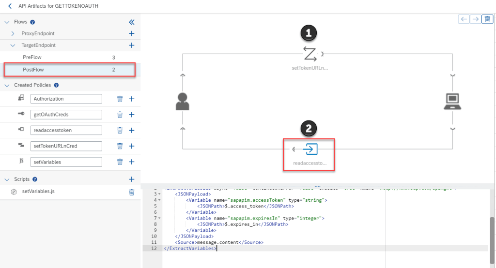 Get data in response and store them in variables<?xml version="1.0" encoding="UTF-8" standalone="yes"?> <ExtractVariables async="false" continueOnError="false" enabled="true" xmlns="http://www.sap.com/apimgmt"> <JSONPayload> <Variable name="sapapim.accessToken" type="string"> <JSONPath>$.access_token</JSONPath> </Variable> <Variable name="sapapim.expiresIn" type="integer"> <JSONPath>$.expires_in</JSONPath> </Variable> </JSONPayload> <Source>message.content</Source> </ExtractVariables>