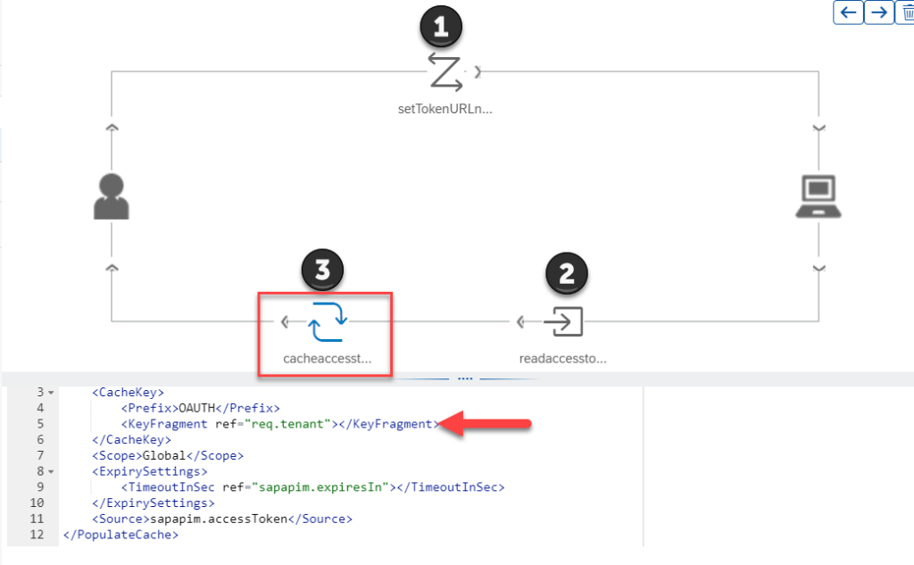 cache access token base upon header value of key tenant(DEV/PRD)<?xml version="1.0" encoding="UTF-8" standalone="yes"?> <PopulateCache async="false" continueOnError="false" enabled="true" xmlns="http://www.sap.com/apimgmt"> <CacheKey> <Prefix>OAUTH</Prefix> <KeyFragment ref="req.tenant"></KeyFragment> </CacheKey> <Scope>Global</Scope> <ExpirySettings> <TimeoutInSec ref="sapapim.expiresIn"></TimeoutInSec> </ExpirySettings> <Source>sapapim.accessToken</Source> </PopulateCache>