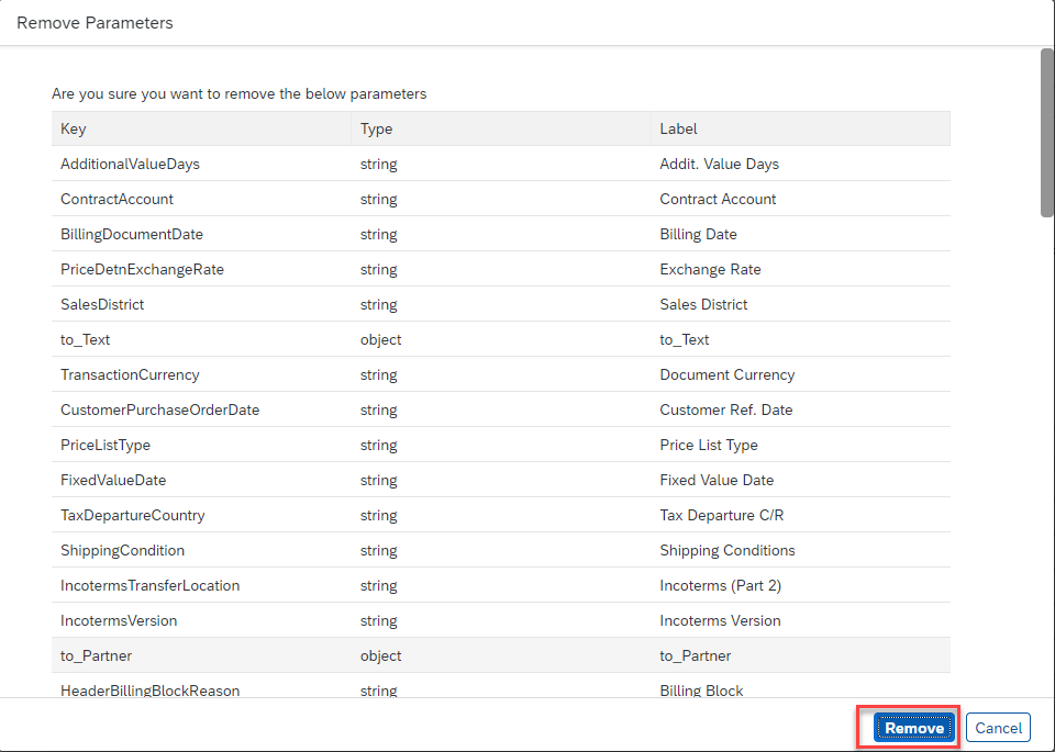 - Next, we will choose fields input and output. Because boy for this API just a few field so another field we will remove. Base on your S/4 HANA on-premise we will have default value differently
