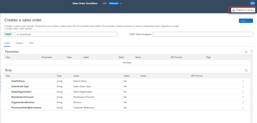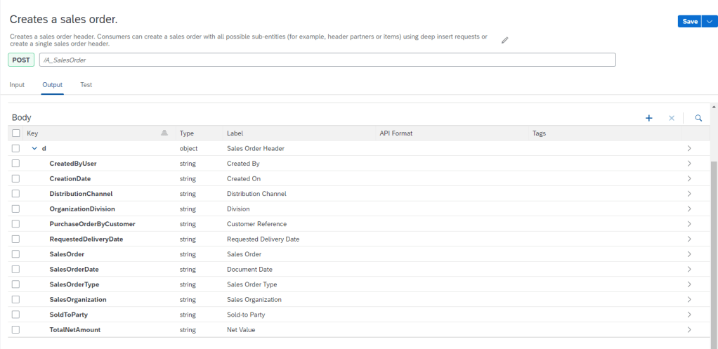 | Endpoint | https://<host s4hana>:44300/sap/opu/odata/SAP/API_SALES_ORDER_SRV/A_SalesOrder?sap-client=<sap-client> |