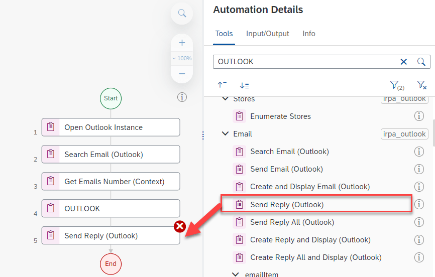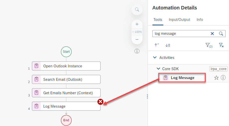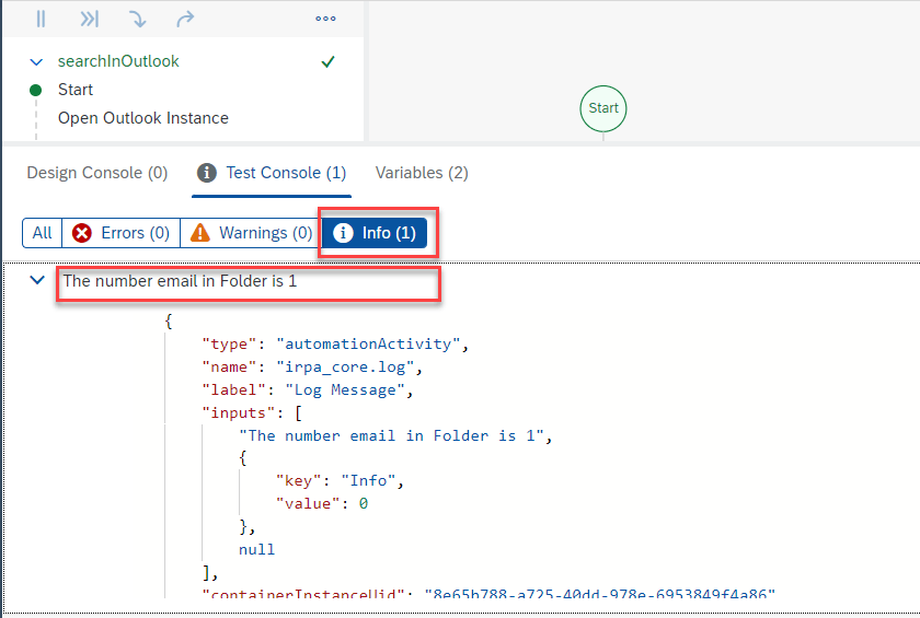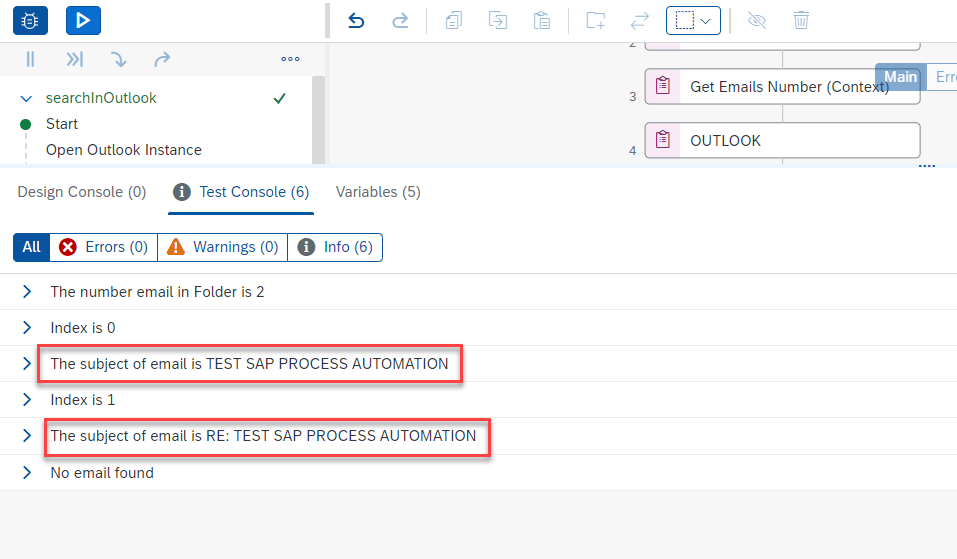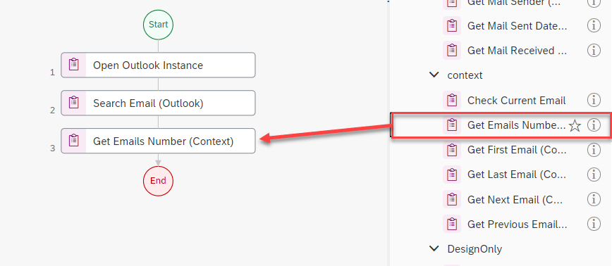 - Drag Get Emails Number context to count how many email in folder and test it by using Log Message context