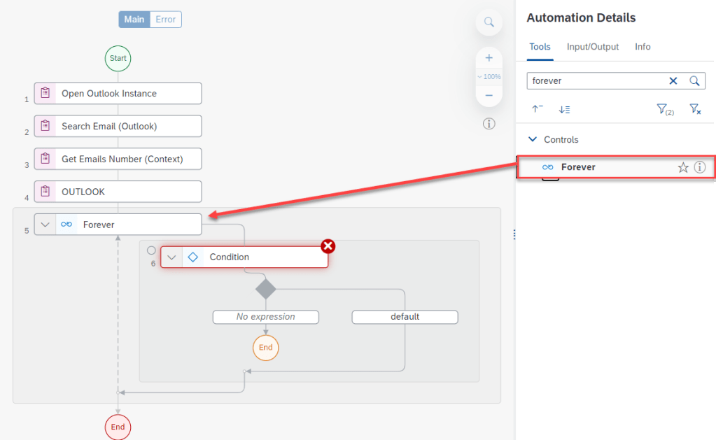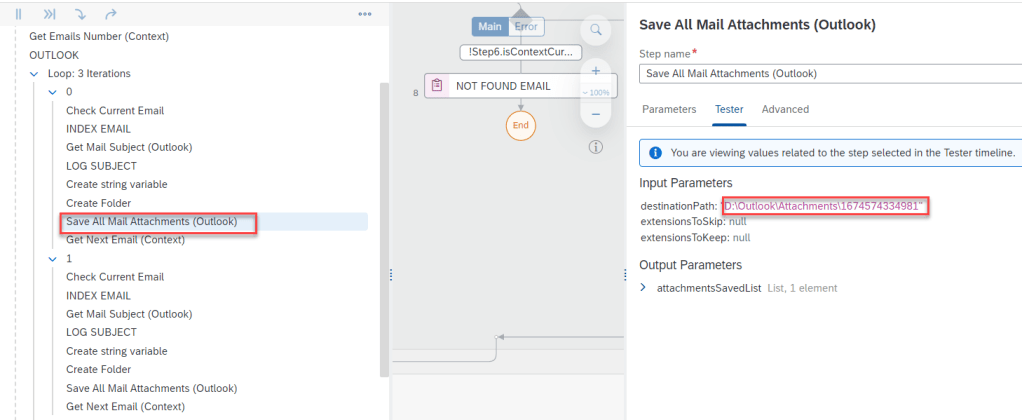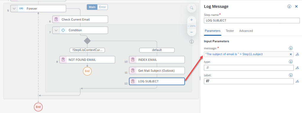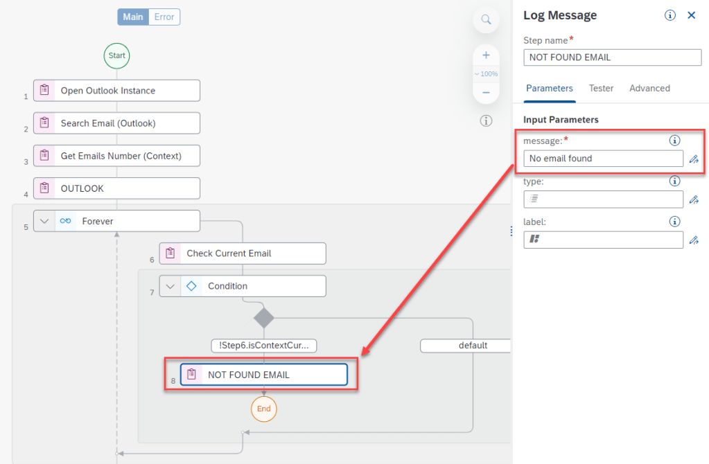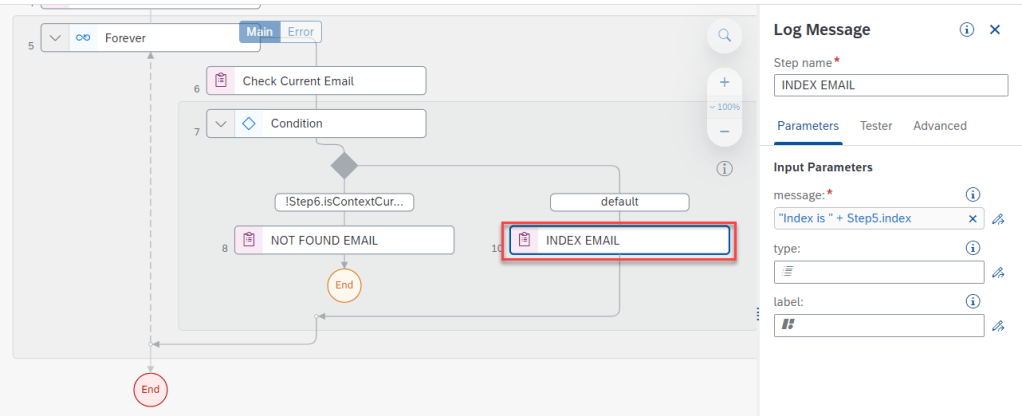 - Base on value isContextCurrentEmailExist of context (true/false) to configure for Condition. If false then LOG MESSGE and end loop, else next loop.