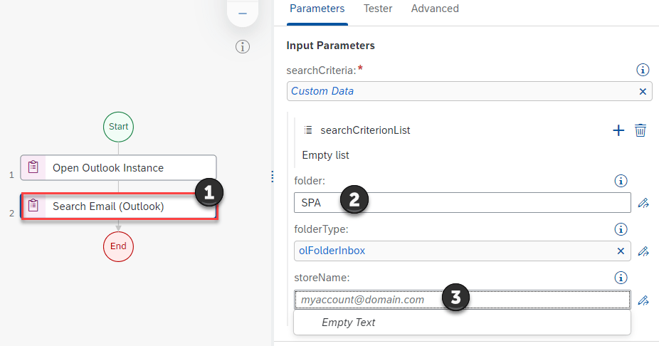 | storeName | Email address which you want to search mail in there. This mail address have to configure in Microsoft Outlook |