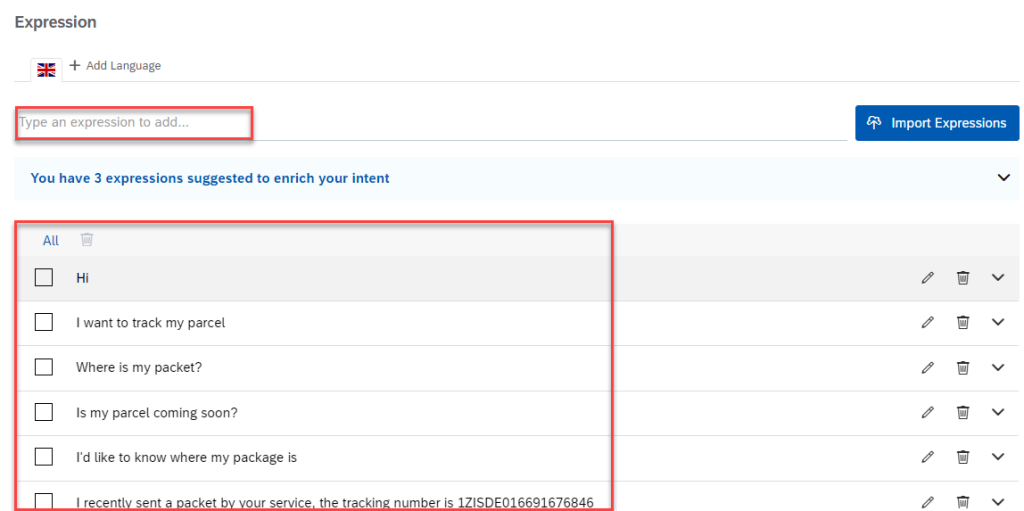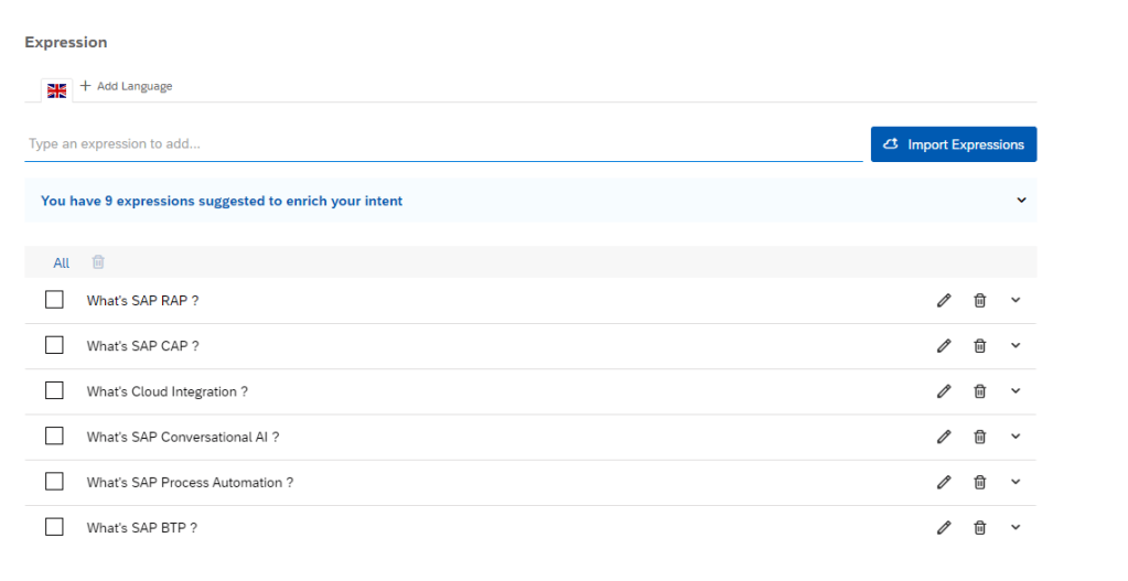 Add Expression for BOT, this step we train for BOT understand languages of user