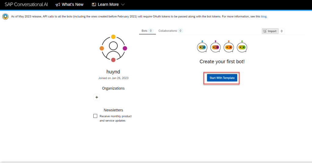 After created account on SAP Conversational AI, we can Sign In. On index page, we can create new bot project by using template