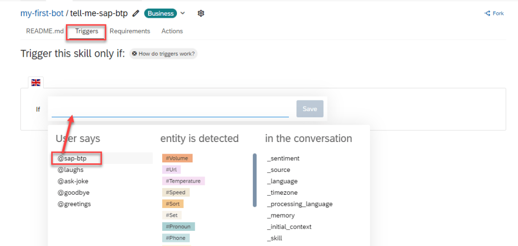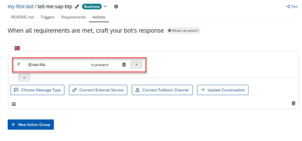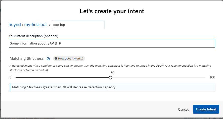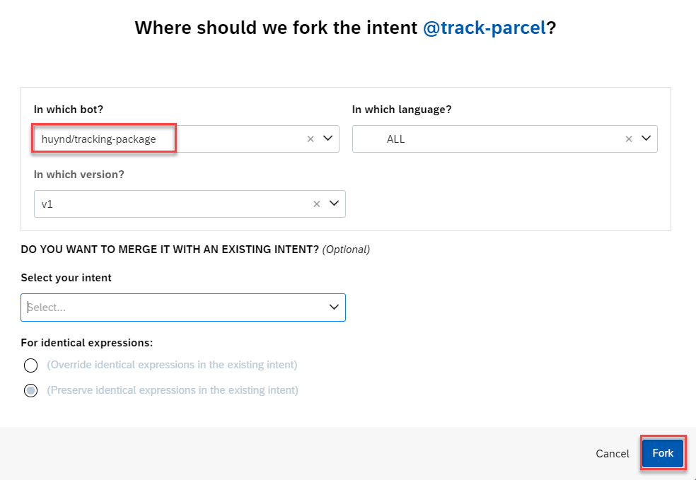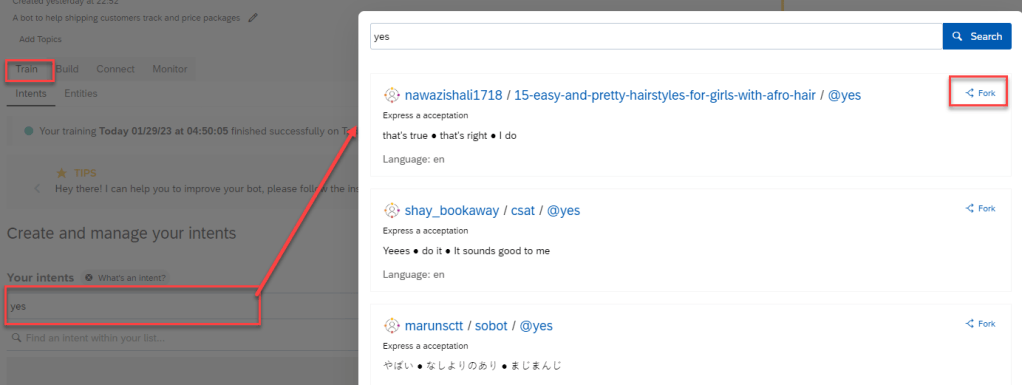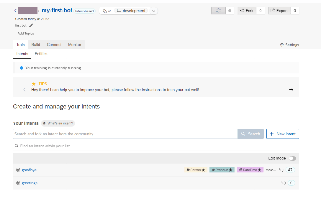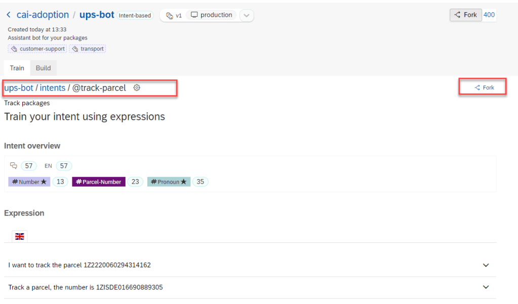 As SAP Conversational AI is collaborative, you don’t have to recreate each intent every time you want to use it. You can fork an intent that someone has already created to clone it right into your bot.