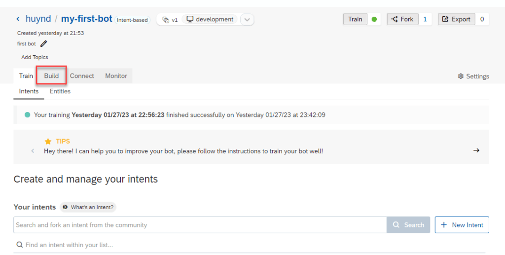 OK, now that BOT knows How to understand people who talk to it. Next, We will give BOT some skill by using BUILD functionality