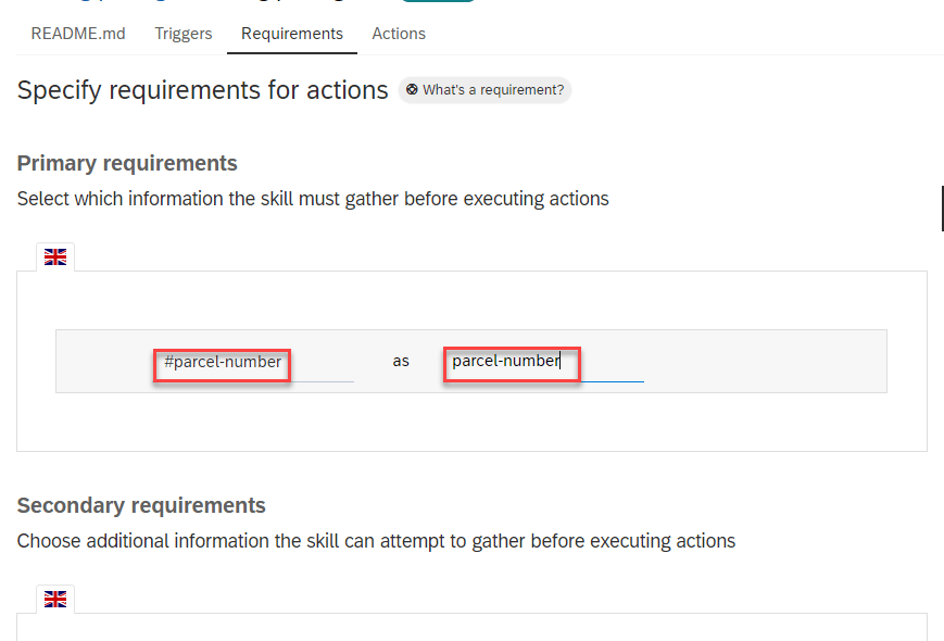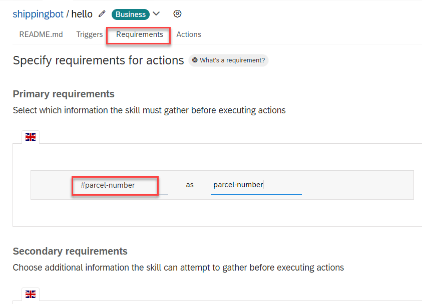 Requirements are either intents or entities that your skill needs to retrieve before executing actions. Requirements are pieces of information that are important in the conversation, and that your bot can use, for example, the user’s name or a location.