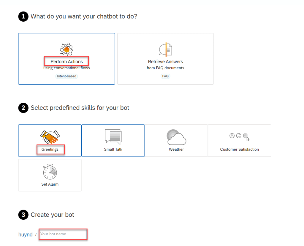 With a standard Perform Actions bot, the developer is responsible for creating entities and intents with expressions. The developer is also responsible for building and managing the conversational flow that pulls information from back-end systems to help simplify processes for the chatbot end user.