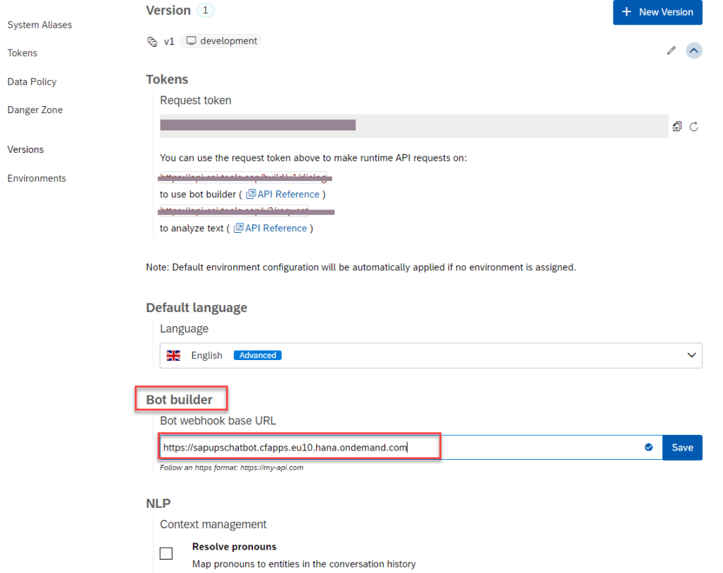 | Endpoint web hook | https://sapupschatbot.cfapps.eu10.hana.ondemand.com |