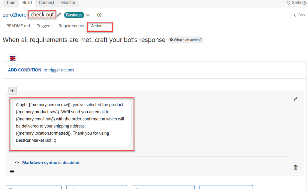 In this, we will build action for BOT. First we will build action for SKILL add-to-cart. After all requirement of skill add-to-catr finished, action will be triggered.
