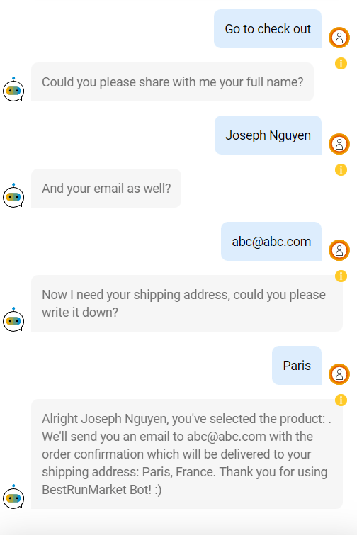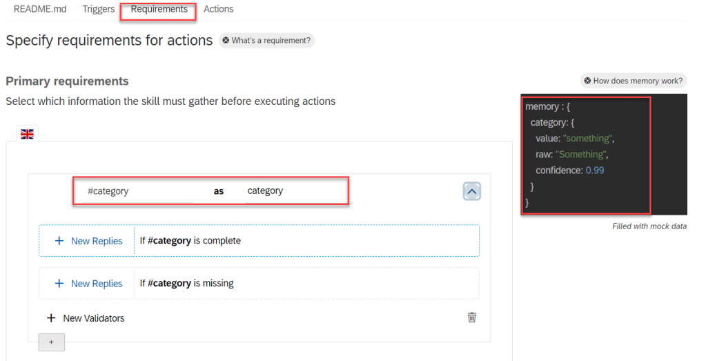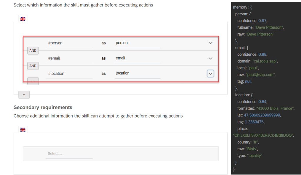 - This skill have no trigger, just have requirement. User need to input value for entity #people. If missing, BOT will reply text to require user input persanal information like FULL NAME, EMAIL