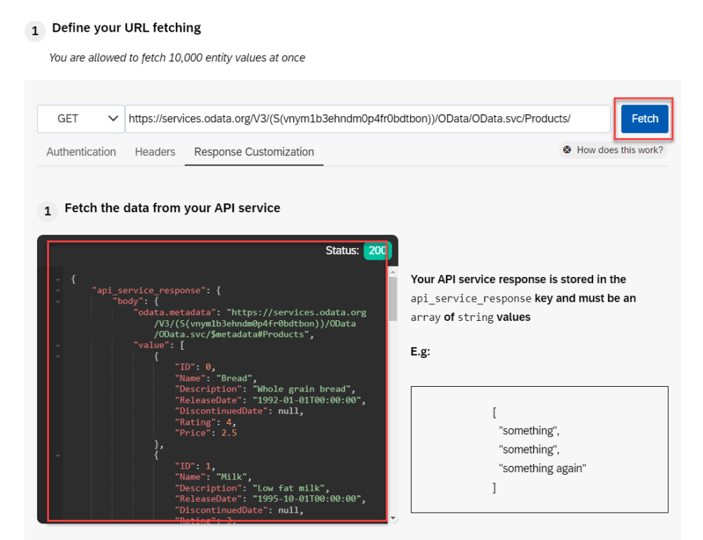 Next, we will create the same entity for PRODUCTS but this time we will fetch data from ODATA API