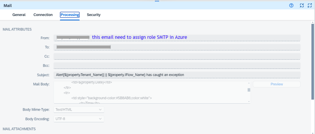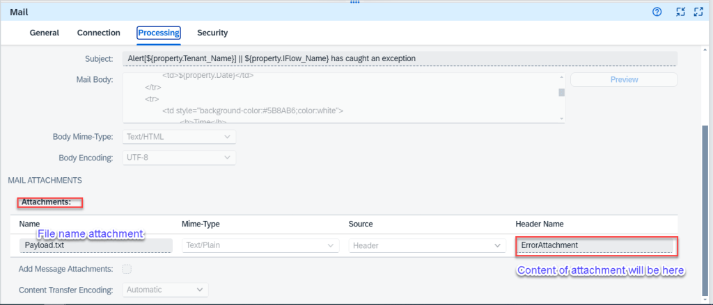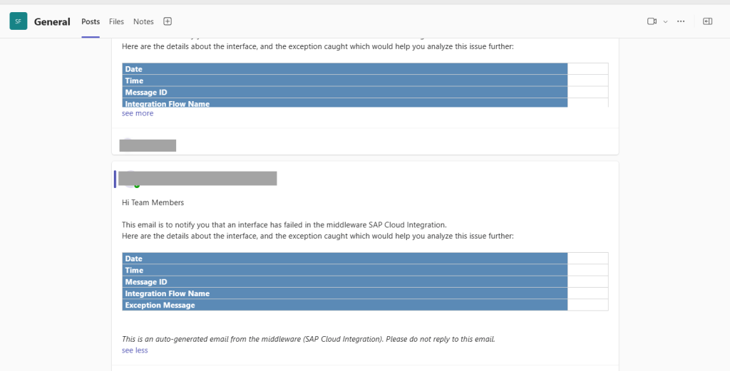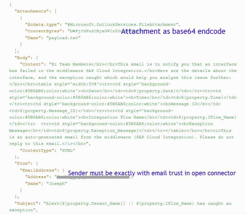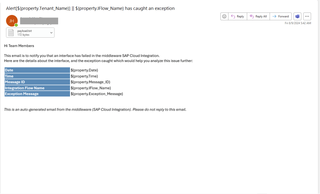 "content": "Hi Team Members</br></br>This email is to notify you that an interface has failed in the middleware SAP Cloud Integration.</br>Here are the details about the interface, and the exception caught which would help you analyze this issue further:</br></br><table style='width:50%'><tr><td style='background-color:#5B8AB6;color:white'><b>Date</b></td><td>${property.Date}</td></tr><tr><td style='background-color:#5B8AB6;color:white'><b>Time</b></td><td>${property.Time}</td></tr><tr><td style='background-color:#5B8AB6;color:white'><b>Message ID</b></td><td>${property.Message_ID}</td></tr><tr><td style='background-color:#5B8AB6;color:white'><b>Integration Flow Name</b></td><td>${property.IFlow_Name}</td></tr> <tr><td style='background-color:#5B8AB6;color:white'><b>Exception Message</b></td><td>${property.Exception_Message}</td></tr></table></br></br><i>This is an auto-generated email from the middleware (SAP Cloud Integration). Please do not reply to this email.</i></br>"