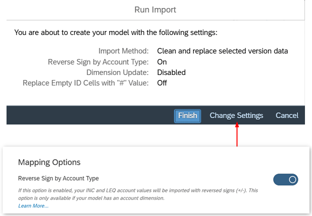When uploading data from flat file to SAC Model and hit Run Import, you can change the Reverse Sign option by clicking Change Settings: