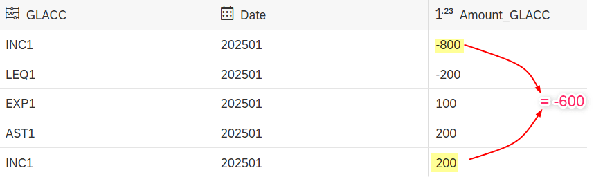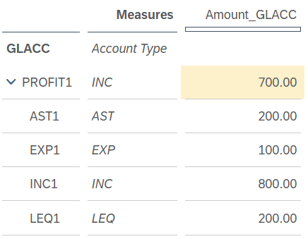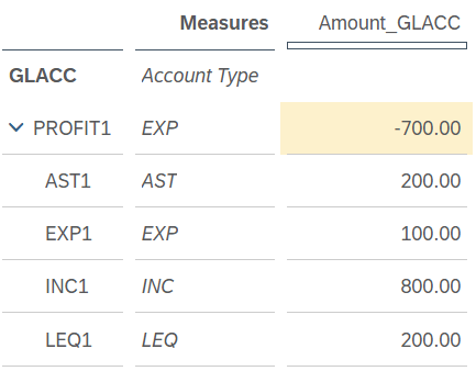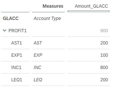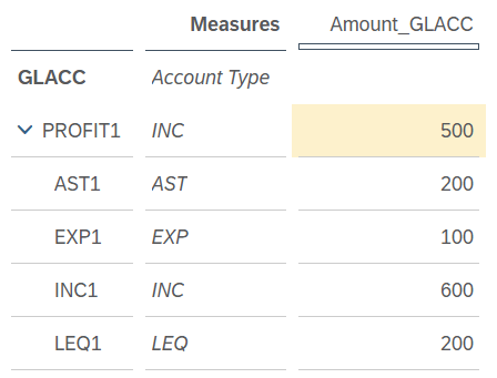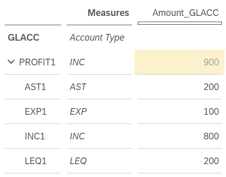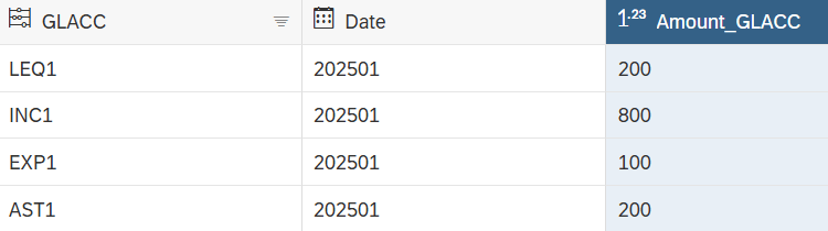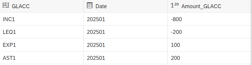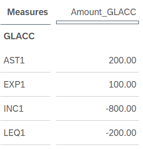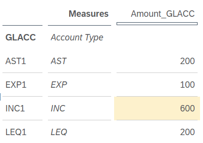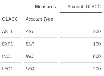 In this example, I built a simple model with 4 financial account types: INC, EXP, AST, and LEQ, and one measure called Amount_GLACC to store the value. Sample data would be like this: