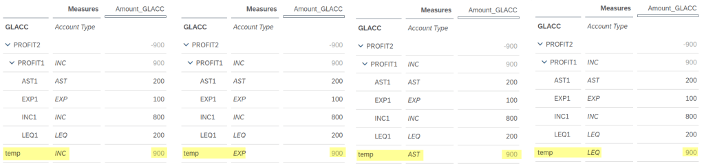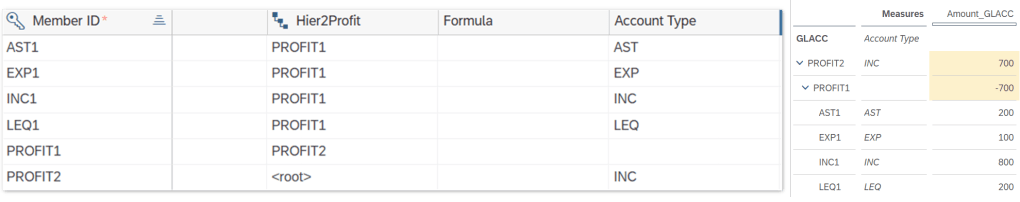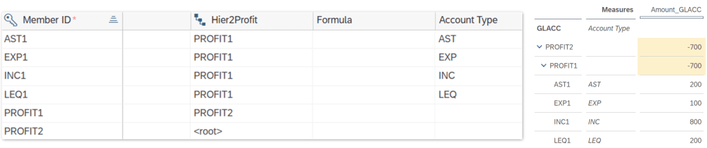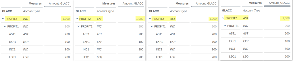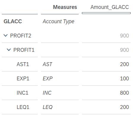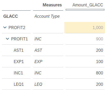 In the case that PROFIT1 is not assigned with account type, the rule to calculate PROFIT2 still follows the same method: