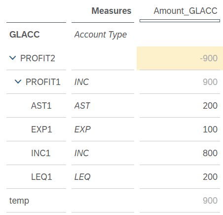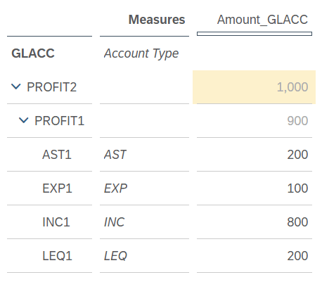 If following the above rule using the actual value of members to calculate, it should equal to -800+100 = -700. But for the case that member has formula, it use the story value to calculate. In this example, PROFIT1 = INC1 + EXP1 = 800 + 100 = 900.