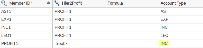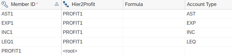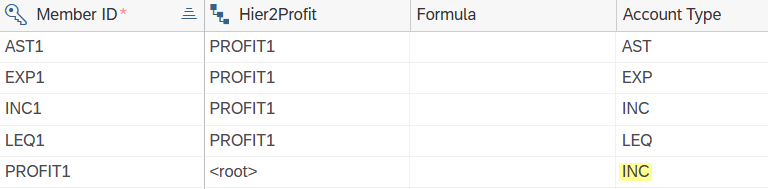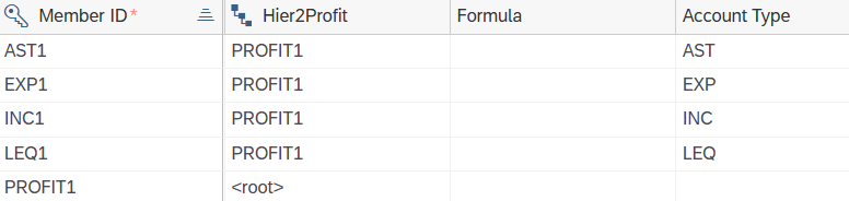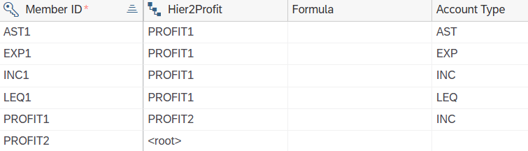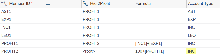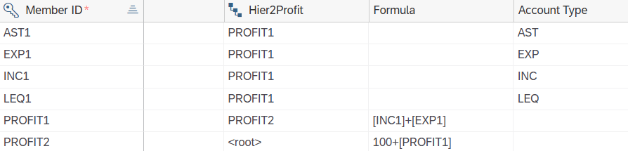 #2: Second, PROFIT2 as parent of PROFIT1 , no formula or account type assigned: