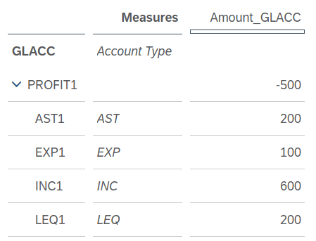 In this example: PROFIT1 = INC1 + EXP1 + AST1 + LEQ1 = -600 + 100 +200 -200 = -500