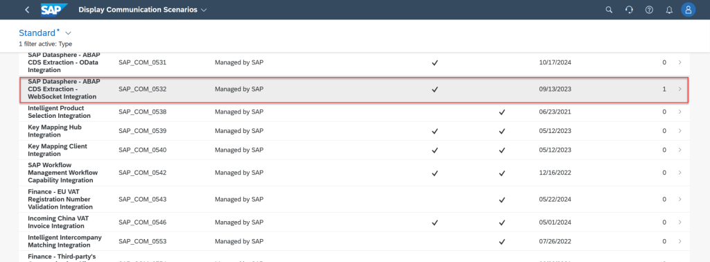 Check communication scenario for integrated with Datasphere – In S/4HANA public cloud, existing one standard scenario used for integrated with BTP Datasphere. We will use this one to create communication arrangement.