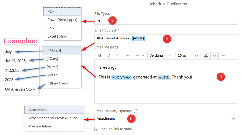 You have 5 options of dynamic texts to define the Date Time or Story Name, please see the example for each in above screenshot.