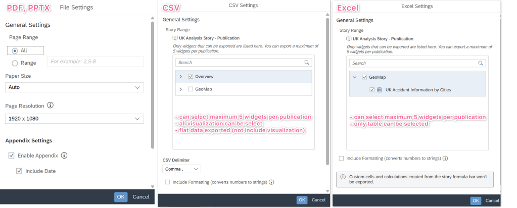 - PDF, PPTX : print our your story with all visualization displayed
