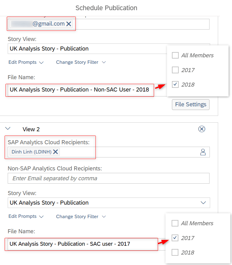 Testing context: My story has 1 story filter: Date, I will schedule publications to SAC and non-SAC users with specific year filter applied.