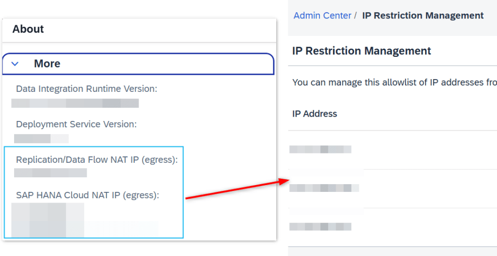 - Get SAP HANA Cloud NAT IP (egress) and Replication/Data Flow NAT IP (egress):